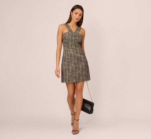 Embrace a classic fabric in a new way when you step out in this sleeveless tweed dress. Crafted from luxurious tweed fabric, this dress features a sleek straight neckline and slanted halter straps that add a touch of modern flair. With its flattering sleeveless design and discreet zipper at the center back, this mini dress offers both style and comfort. Perfect for a night out or a day at the office when topped with a blazer, this dress effortlessly combines elegance with a hint of whimsy, making it a standout choice for a fashionable look.|