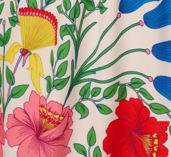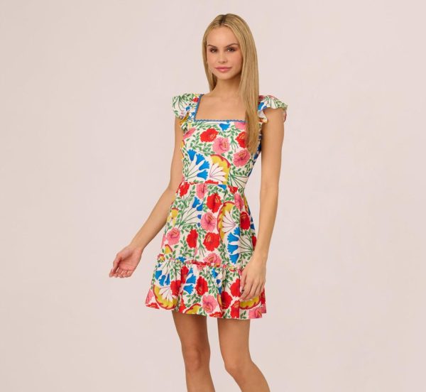 Ruffle sleeves and a ruffle hem give this cute and colorful floral dress its soft volume. The bodice features princess seams and a back zipper for a fitted silhouette with the gathered skirt flaring from the waist. Contrast rickrack trim highlights the flattering square neck collar. This dress is perfect for sunny days, warm nights, and casual celebrations.|