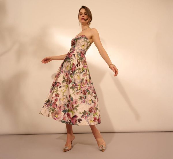 Careful tailoring gives this lush floral midi dress its uniquely stunning silhouette. Princess seams down the bodice meet with skirt pleats at the waist for a full A-line look. Jacquard fabric adds just the right amount of structure. Convenient pockets and a back zipper closure complete the look. Reminiscent of enchanted gardens and verdant bouquets, this gorgeous dress will be your new favorite for special occasions and parties.|