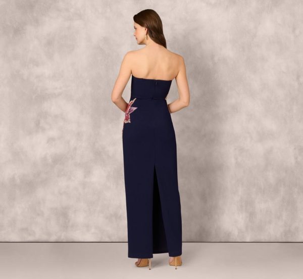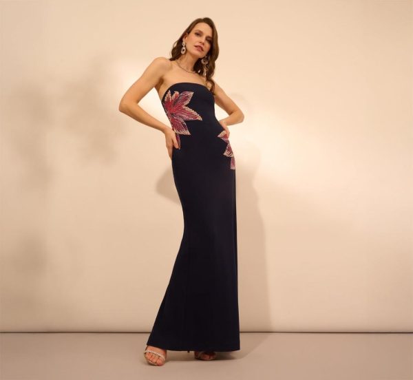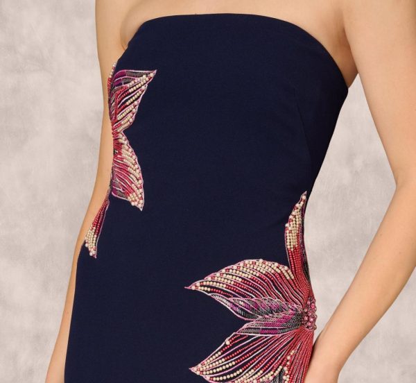 This sophisticated column gown features premium crepe fabric with a luxurious matte finish that beautifully showcases the dazzling embellishments. Two stunning oversized floral motifs, meticulously crafted with intricate embroidery and radiant hand-applied beading, create a show-stopping modern statement. A discreet back zipper provides flawless customization for your perfect fit. When you need that red carpet-ready elegance that turns heads, this is the gown that delivers unforgettable glamour.|