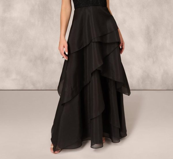Go boldly in a ball gown designed in contrasting yet elegant fabrics. This formal dress features a fitted bodice with an off the shoulder, sweetheart neckline. Boasting a tiered ball skirt crafted from poly organza fabric, this ball gown is contrasted by the floral embroidered fabrication of the bodice with scalloped trim. A hidden zipper closure completes the design at the side. A glamorous look for formal and black-tie occasions, this evening gown will shine with statement earrings and nude high heels.|