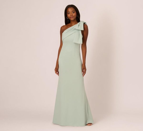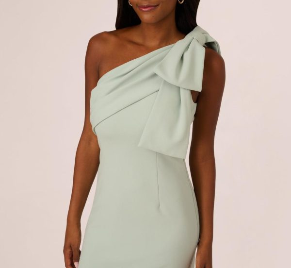 Modern fabrication elevates this classic formal dress for an unforgettable look. This mermaid gown is all about the drama. Featuring a fitted bodice and mermaid skirt, the one shoulder neckline of this gown steals the show boasting pleated details and a large bow accent. Crafted from stretch crepe, this formal dress has no waist seam for an ultra-comfortable look. Styled with nude heels and beaded clutch, this one shoulder gown was made for a black-tie affair.|