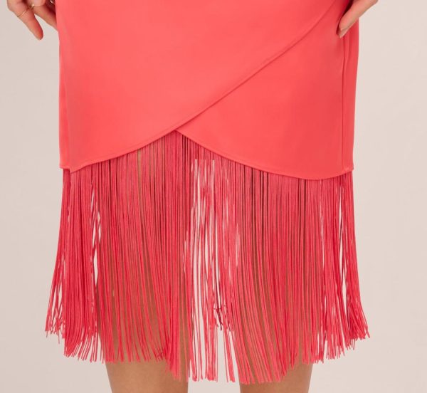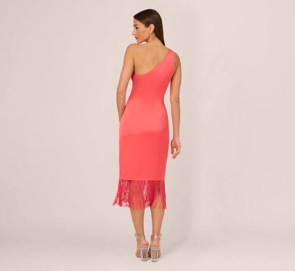 Stunning design makes this seemingly simple one shoulder dress so much more. This party dress features a one shoulder bodice, tulip skirt, and fringe trimmed hem. Crafted from stretch satin, elegant stitch and release pleats at the side of this dress flatter the figure and add drama to the design. A side zipper closure completes this cocktail dress. Perfect for events from cocktail parties to formal occasions, this fringe dress is always fun to step out in when paired with nude heels and your favorite statement jewelry.|