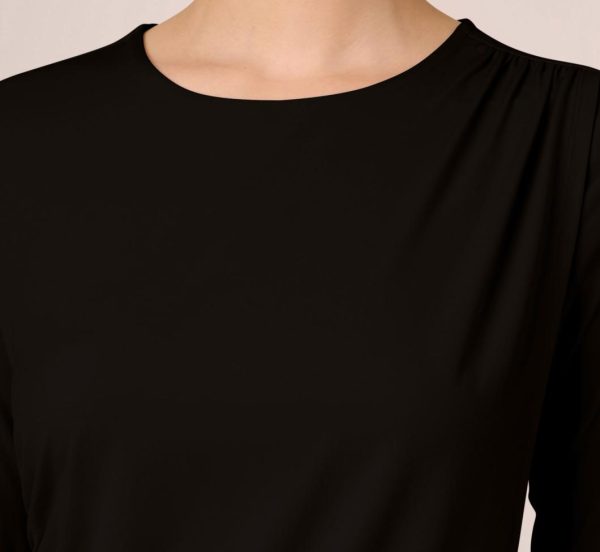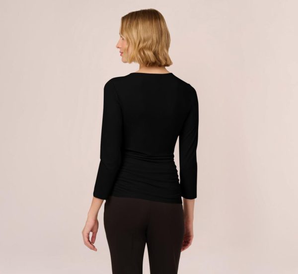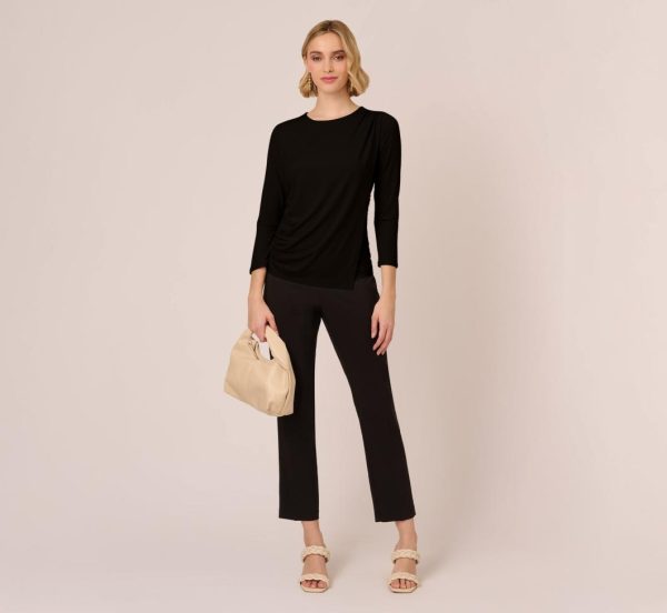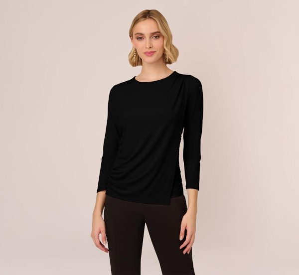Light on fabric, not on details, this three quarter sleeve top is a chic design. This top features a crew neckline, three quarter sleeves, and shirring at waist on both sides. Designed with soft and stretchy jersey fabric, this top is beautifully draped at the front and ultra comfortable for all day wear. Paired with trousers or a skirt, this draped top will always make a statement.|