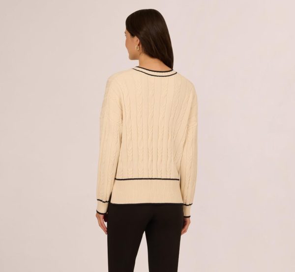 Get cozy in this classic sweater. This pullover sweater features a wide V-neck collar and textured cable knit design. The contrast tipping at the hem, cuffs, and collar add a touch of sporty sophistication. With a relaxed fit and split high-low hem, this sweater is perfect for layering for an easy cool weather look.|