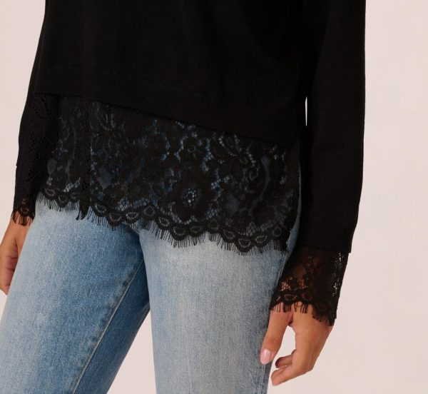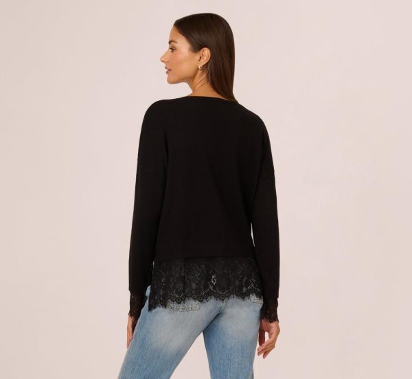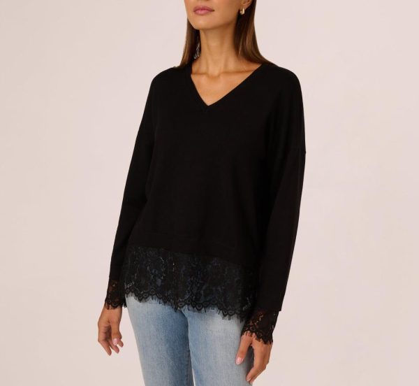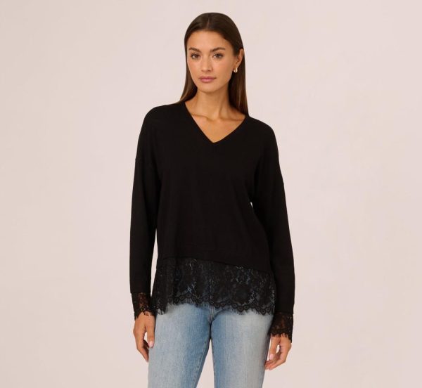 This sophisticated long sleeve sweater features a built-in layered look without adding extra bulk. Delicate lace accents peek out from the hem and cuffs, creating an elegant contrast against the cozy knit construction. The flattering V-neck collar completes this beautifully designed pullover that adds effortless texture and depth to your everyday wardrobe.|