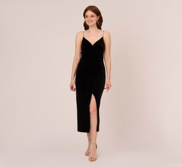 Make every room shine a little brighter when you slip into this velvet dress. This formal dress features a faux wrap bodice with large pleated details, rhinestone-clad tank straps, and an ankle-length skirt. Crafted from a delightfully soft velvet, this ankle-length dress has subtle stretch. A zipper closure at the center back of this sleeveless gown. Matching stone accessories will add further glamor to this velvet gown for formal and black-tie events.|