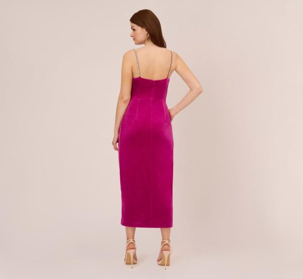 Make every room shine a little brighter when you slip into this velvet dress. This formal dress features a faux wrap bodice with large pleated details, rhinestone-clad tank straps, and an ankle-length skirt. Crafted from a delightfully soft velvet, this ankle-length dress has subtle stretch. A zipper closure at the center back of this sleeveless gown. Matching stone accessories will add further glamor to this velvet gown for formal and black-tie events.|