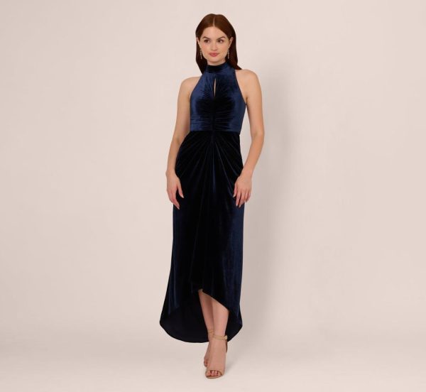 Whether the guest of the hour or just on the guest list, this velvet high low gown will have all eyes on you. This formal dress features a halter bodice with a mock neckline, a cutout at the center of the bust, and a high low mermaid skirt. Made with luxe velvet, this evening gown is shirred through the body and draped at the hip of the skirt for a figure-flattering look. A hidden zipper closure at the center back of this sleeveless gown completes the design. Styled with nude heels and statement earrings, this hater gown is ready for a glam evening.|